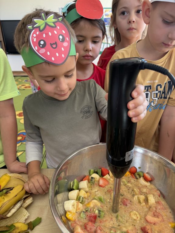 Wszyscy przebrali się w tym dniu za owoce lub warzywa – było pięknie i kolorowo. Oprócz tańców i zabaw przygotowywaliśmy koktajle owocowe, soki , sałatki a także próbowaliśmy różnych , czasem bardzo egzotycznych owoców
